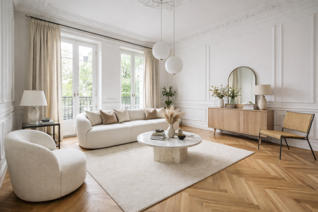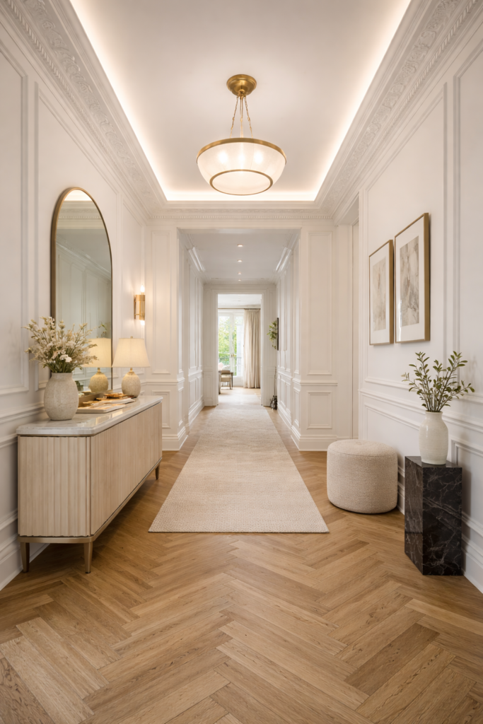 Nous réalisons des aménagements intérieurs haut de gamme, alliant élégance et modernité. Pose de moulures murales et plafond, intégration de bandes LED discrètes pour une ambiance raffinée, et installation de parquet style haussmannien pour un cachet authentique.